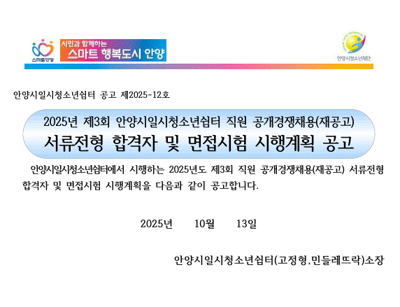 | 다음 | [공고]2025년 제3회 일시청소년쉼터 직원 공개경쟁채용(재공고) 최종합격자 공고 |