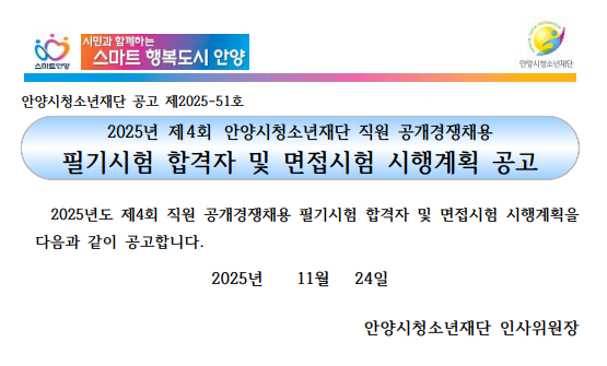 | 제목 | [공고]2025년 제4회 안양시청소년재단 직원 공개경쟁채용 필기시험 합격자 및 면접전형 시행계획 공고 |