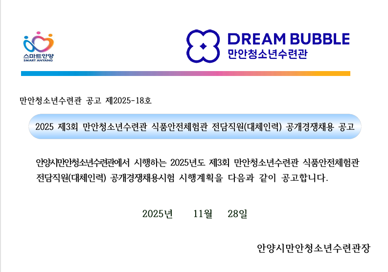 | 제목 | 2025년 제3회 만안청소년수련관 식품안전체험관 전담직원(대체인력) 공개경쟁채용 공고 |