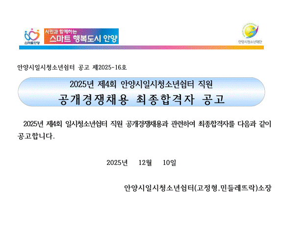 | 제목 | [공고]2025년 제4회 일시청소년쉼터 직원 공개경쟁채용 최종합격자 공고 |