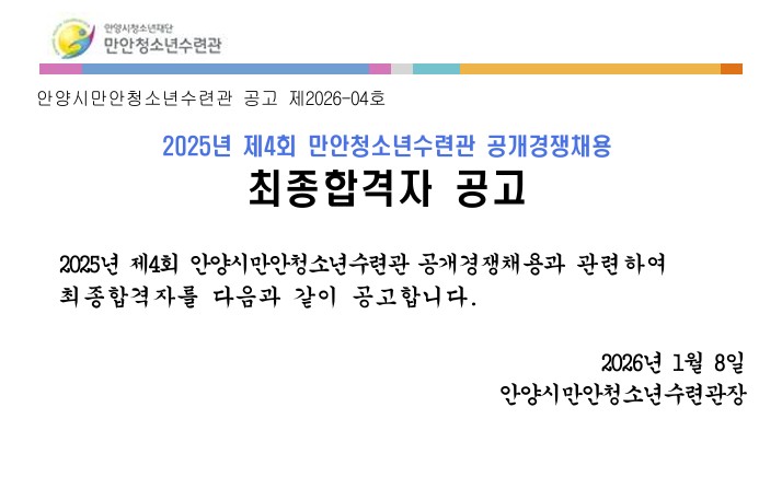 | 제목 | 2025년 제4회 만안청소년수련관 공개경쟁채용 면접시험 결과보고 및 최종 합격자 공고 |