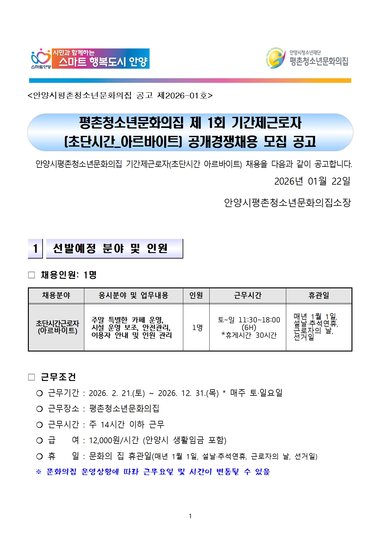 | 제목 | [공고]2026년 제1회 안양시평촌청소년문화의집 초단시간 근로자(아르바이트) 공개경쟁채용 공고 |