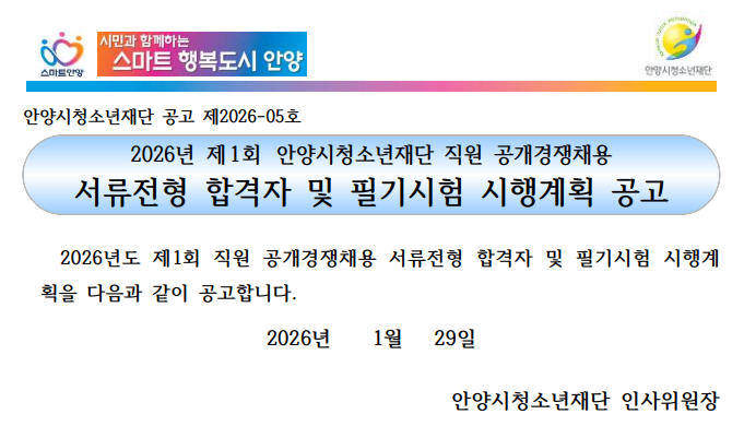 | 제목 | [공고]2026년 제1회 안양시청소년재단 직원 공개경쟁채용 서류전형 결과 및 필기시험 시행계획 공고 |