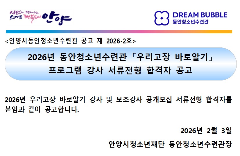 | 이전 | 2026년 안양시관양청소년문화의집 제1회 초단시간근로자 (환경미화 아르바이트) 공개경쟁채용 최종합격자 공고 |