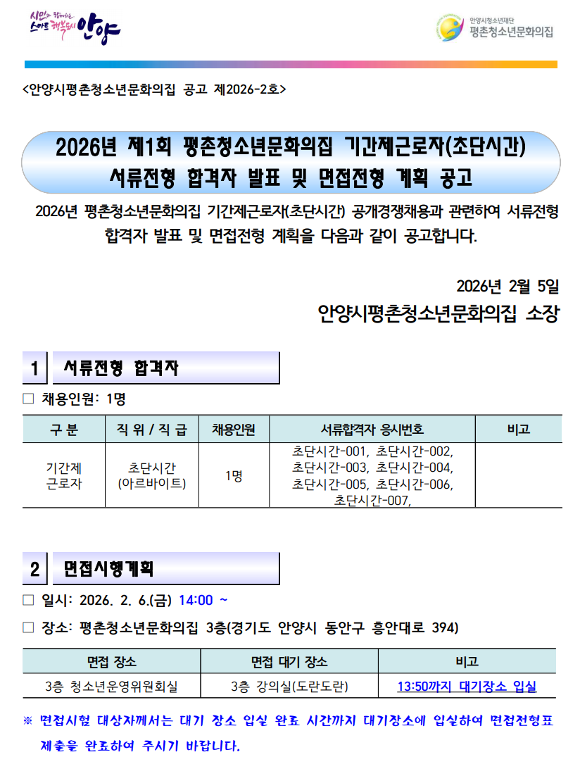 | 제목 | [공고]2026년 제1회 평촌청소년문화의집 기간제(초단시간)근로자 공개경쟁채용 서류전형 합격자 및 면접시험 시행계획 공고 |