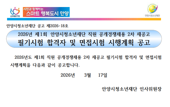 | 제목 | [공고]2026년 제1회 안양시청소년재단 직원 공개경쟁채용 2차 재공고 필기시험 합격자 및 면접전형 시행계획 공고 |