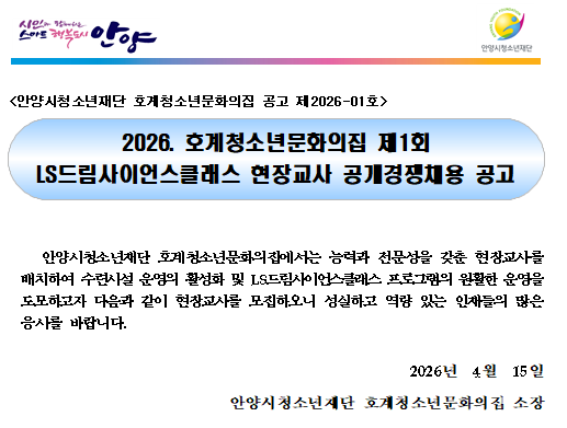| 제목 | [공고]2026년 제1회 안양시호계청소년문화의집 LS드림사이언스클래스 현장교사 공개경쟁채용 공고 |