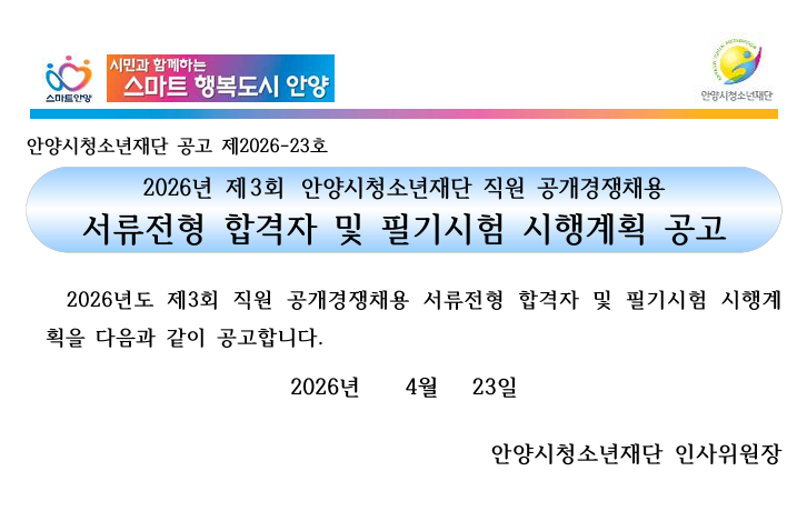 | 제목 | [공고]2026년 제3회 안양시청소년재단 직원 공개경쟁채용 서류전형 합격자 및 필기시험 시행계획 공고 |