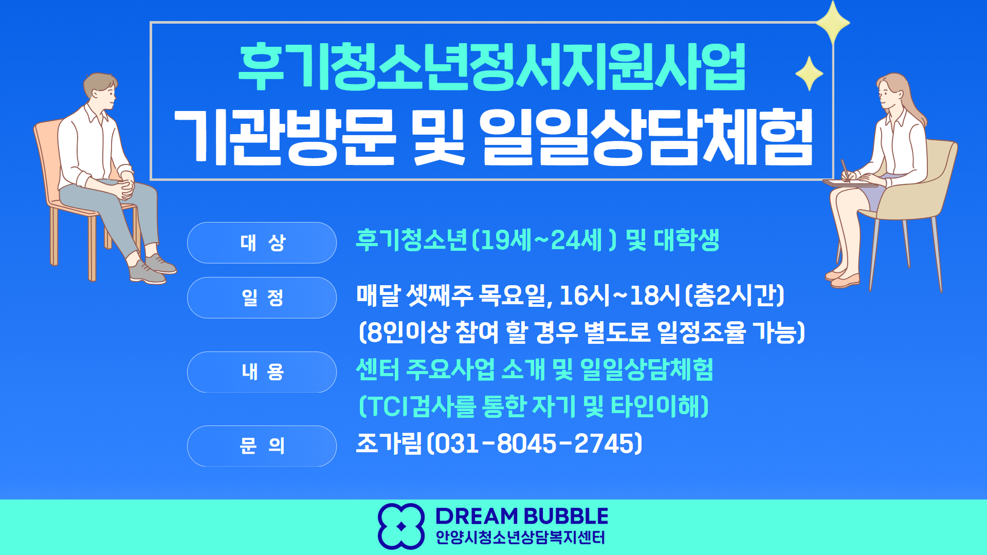 사업내용 개인상담, 1일 상담체험(심리검사를 통한 자기이해 및 타인이해)