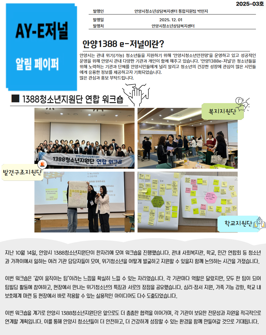 15 | 「안양1388e-저널」 12월호 발간 | 첨부파일 첨부 파일 | 안양시청소년재단(대표이사 안병일) 산하 안양시청소년상담복지센터(센터장 민미연)는 지난 1일 「안양1388e-저널」 12월호를 안양시민과 유관기관을 대상으로 발간·배포하였다. 이번 호에서는 청소년 안전망 강화를 위한 기관 간 협력 사례와 함께, 위기(가능) 청소년의 일상 회복을 돕는 사후관리 프로그램 등 현장의 다양한 지원 활동을 담아 시민들에게 전달하였다. 「안양1388e-저널」은 위기(가능) 청소년을 위해 활동하는 기관과 단체를 시민들에게 소개하고, 청소년의 건강한 성장을 지원하기 위한 정보를 제공하기 위해 기획·운영되고 있다. ... | 등록자 청소년상담복지센터 | 작성일 2025-12-05 |
