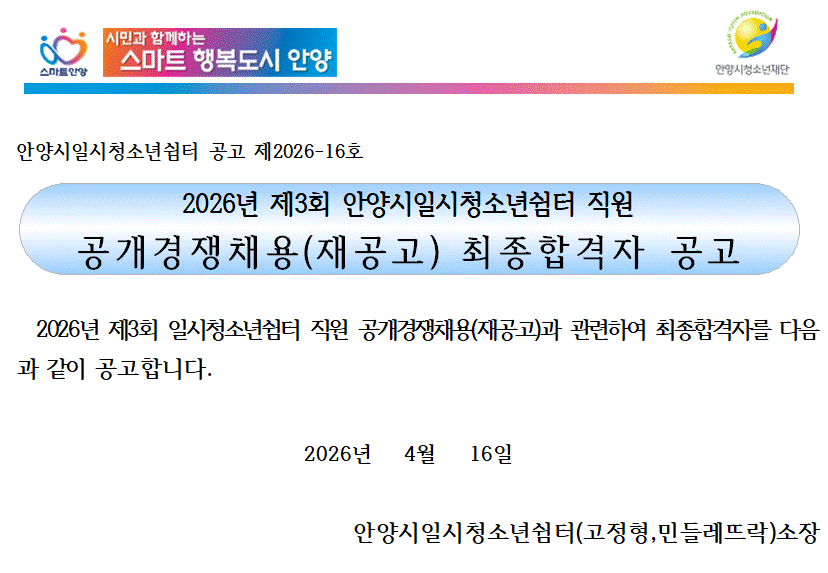 | 제목 | [공고]2026년 제3회 일시청소년쉼터 직원 공개경쟁채용(재공고) 최종합격자 공고 |
