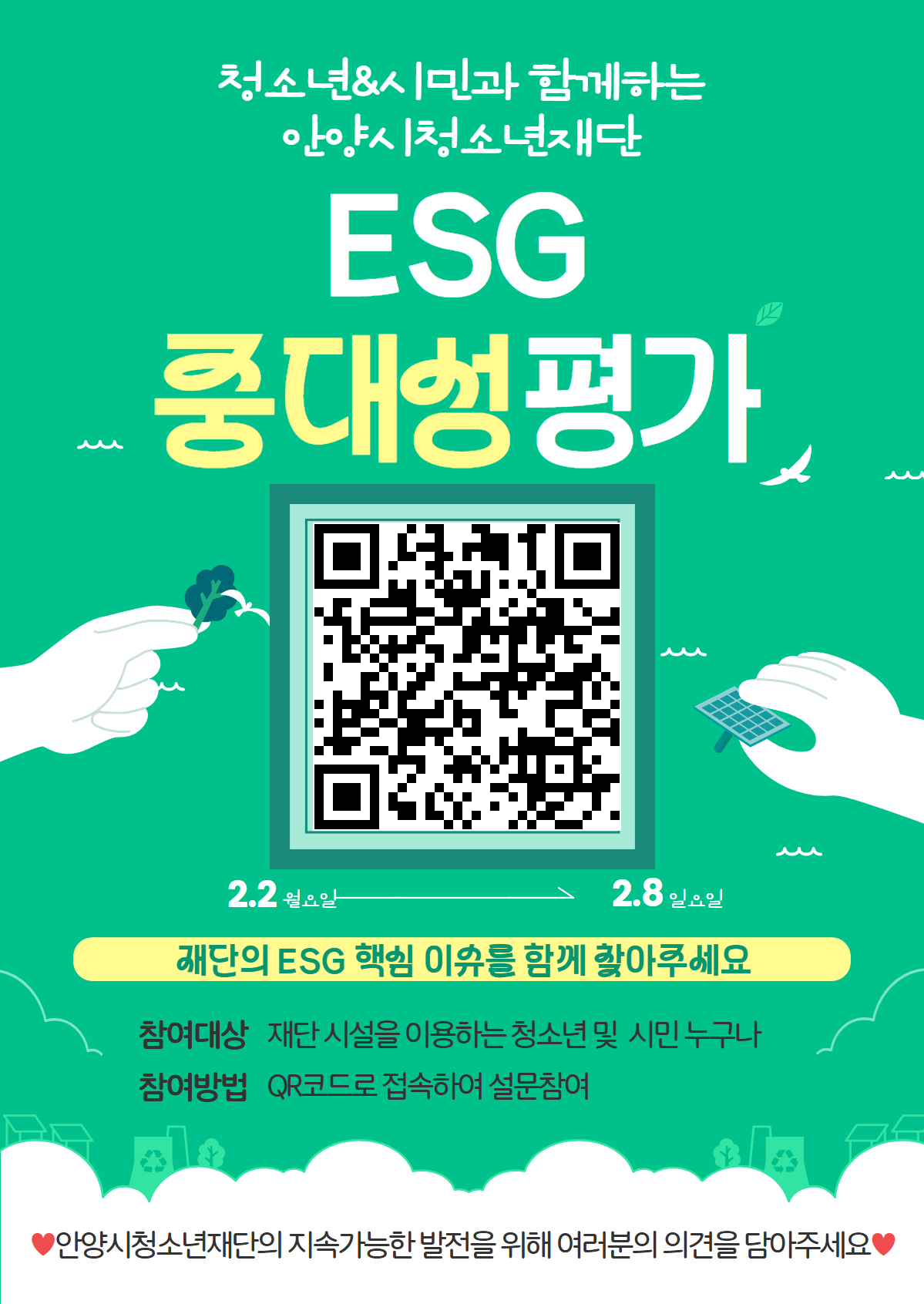 안양시청소년재단 ESG중대성평가를 실시합니다. 본 평가는 재단을 이용하는 청소년 및 시민분들을 대상으로 재단의 핵심 ESG 이슈를 도출하고자 시행합니다. 많은 관심과 참여 부탁드립니다^^