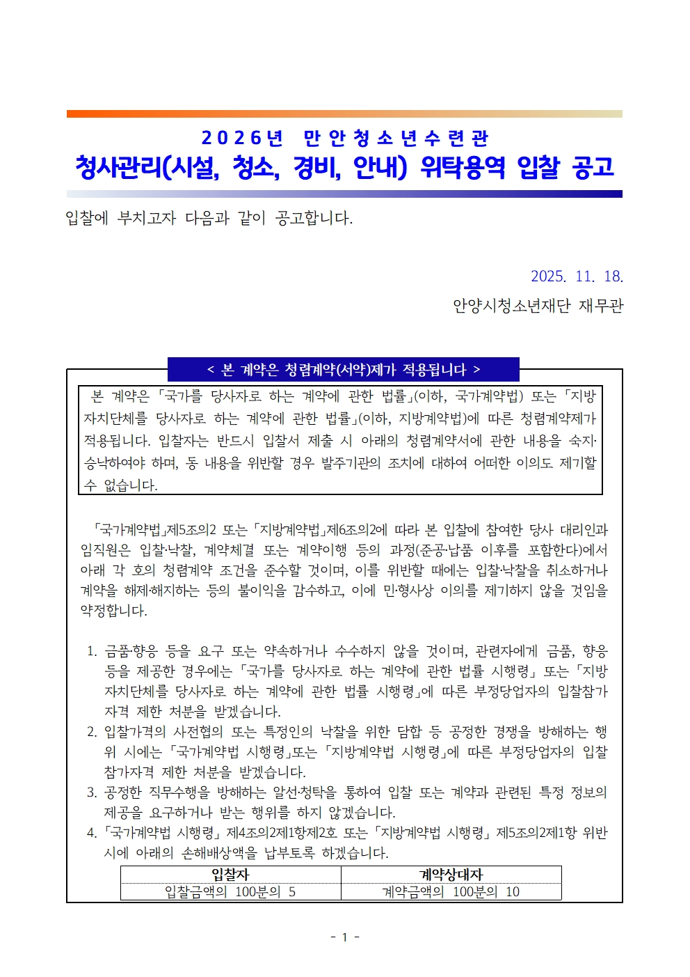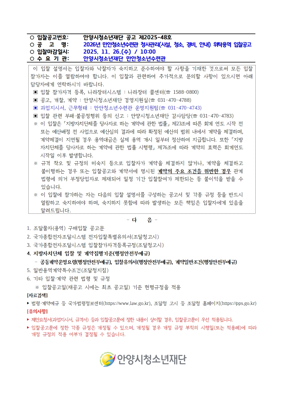 | 제목 | (변경)2026년 만안청소년수련관 청사관리(시설, 청소, 경비, 안내) 위탁 용역 공개 입찰 변경공고 |