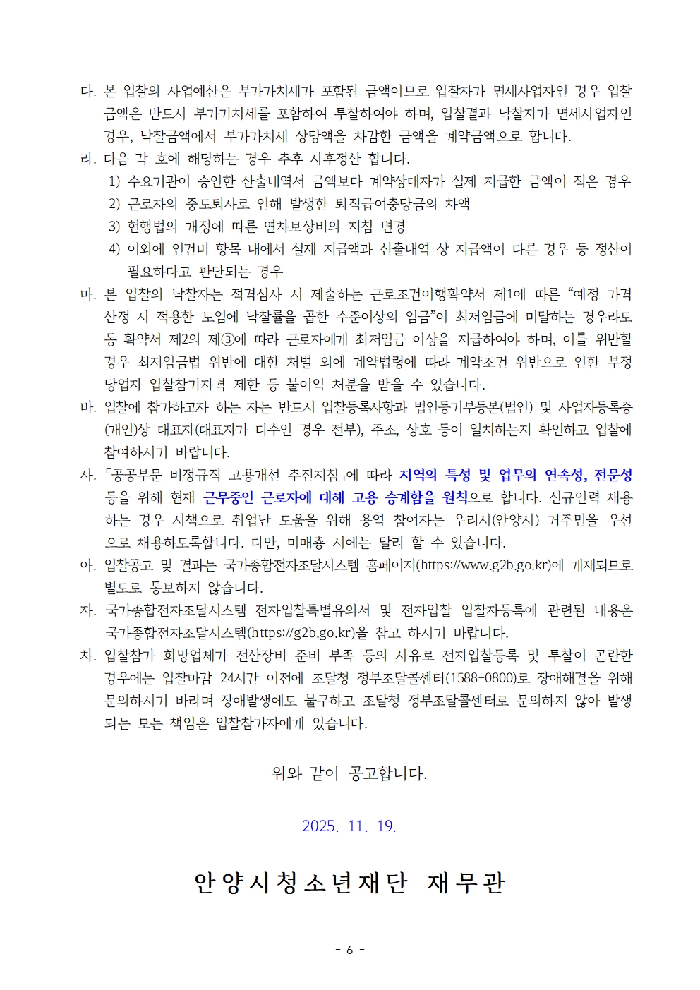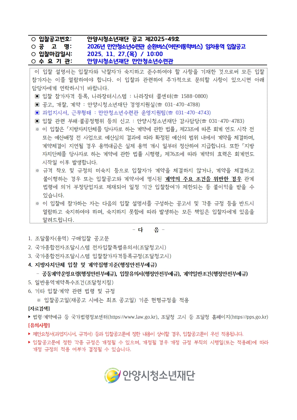 | 제목 | 2026년 만안청소년수련관 순환버스(어린이 통학버스) 임차 용역 공개 입찰 재공고 |