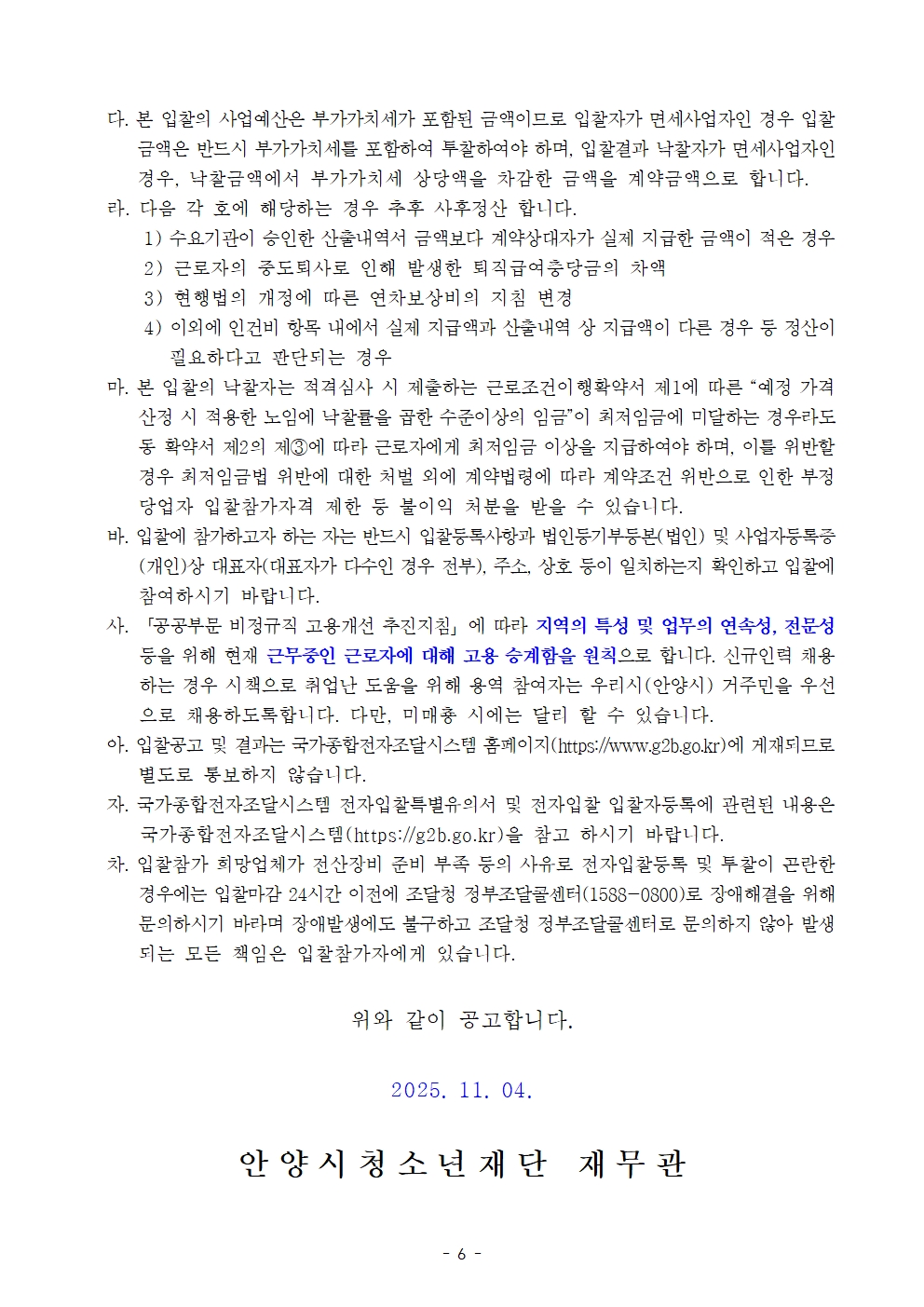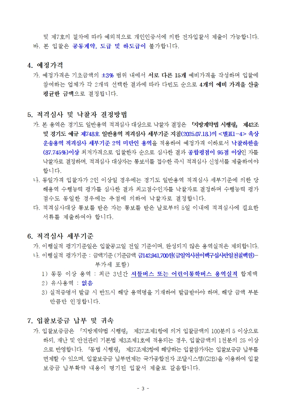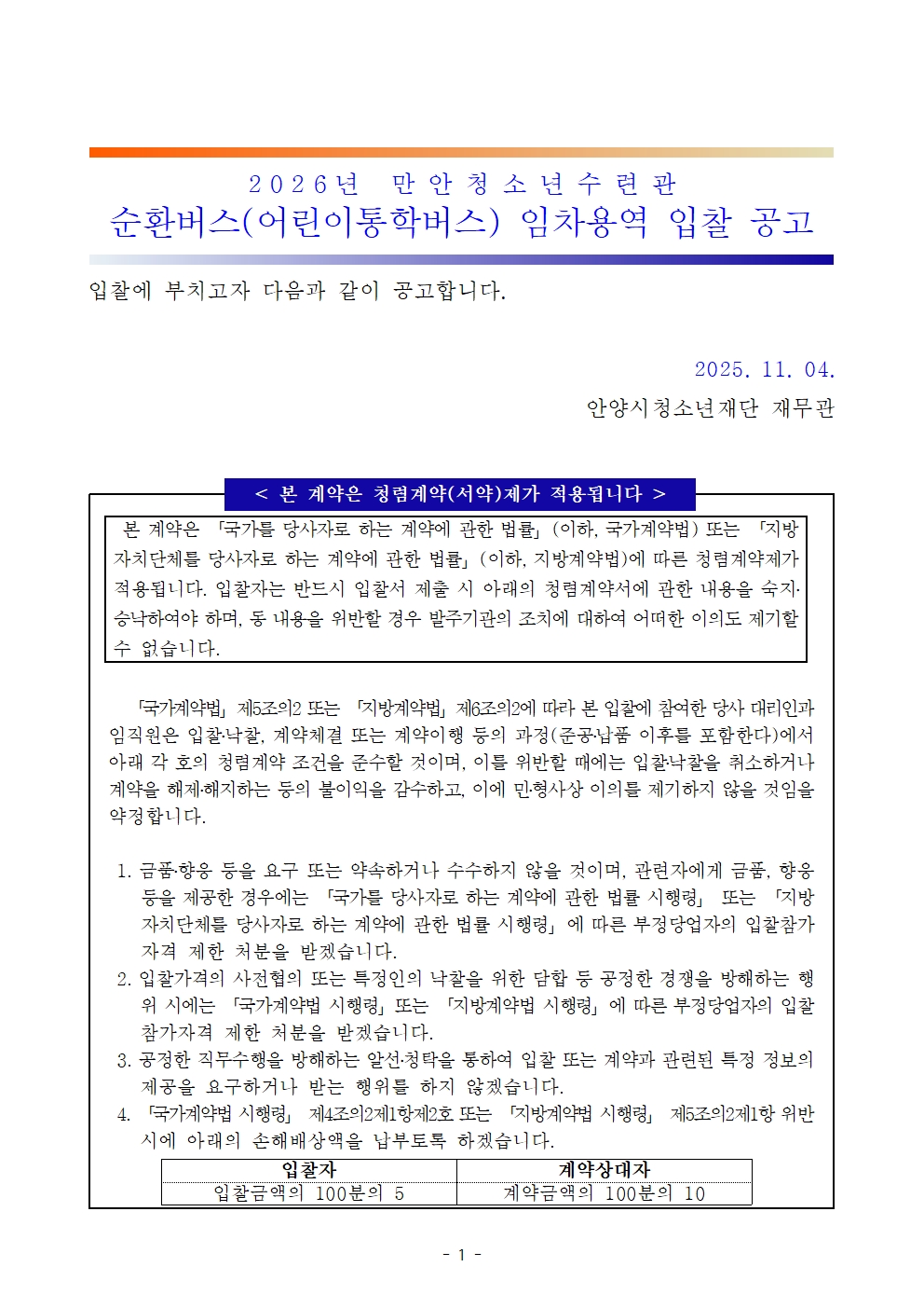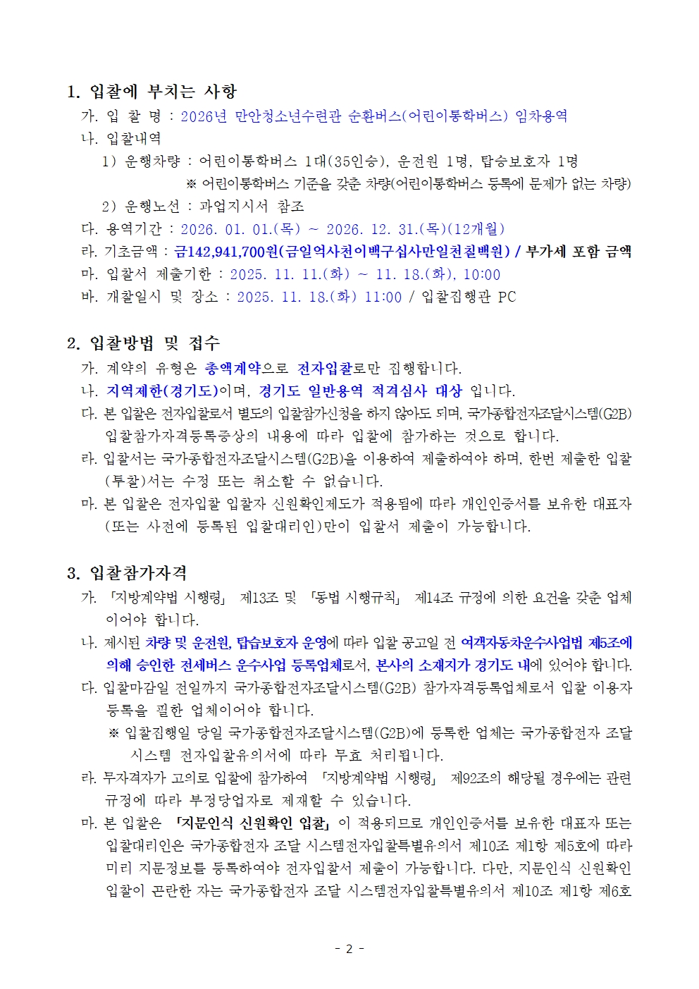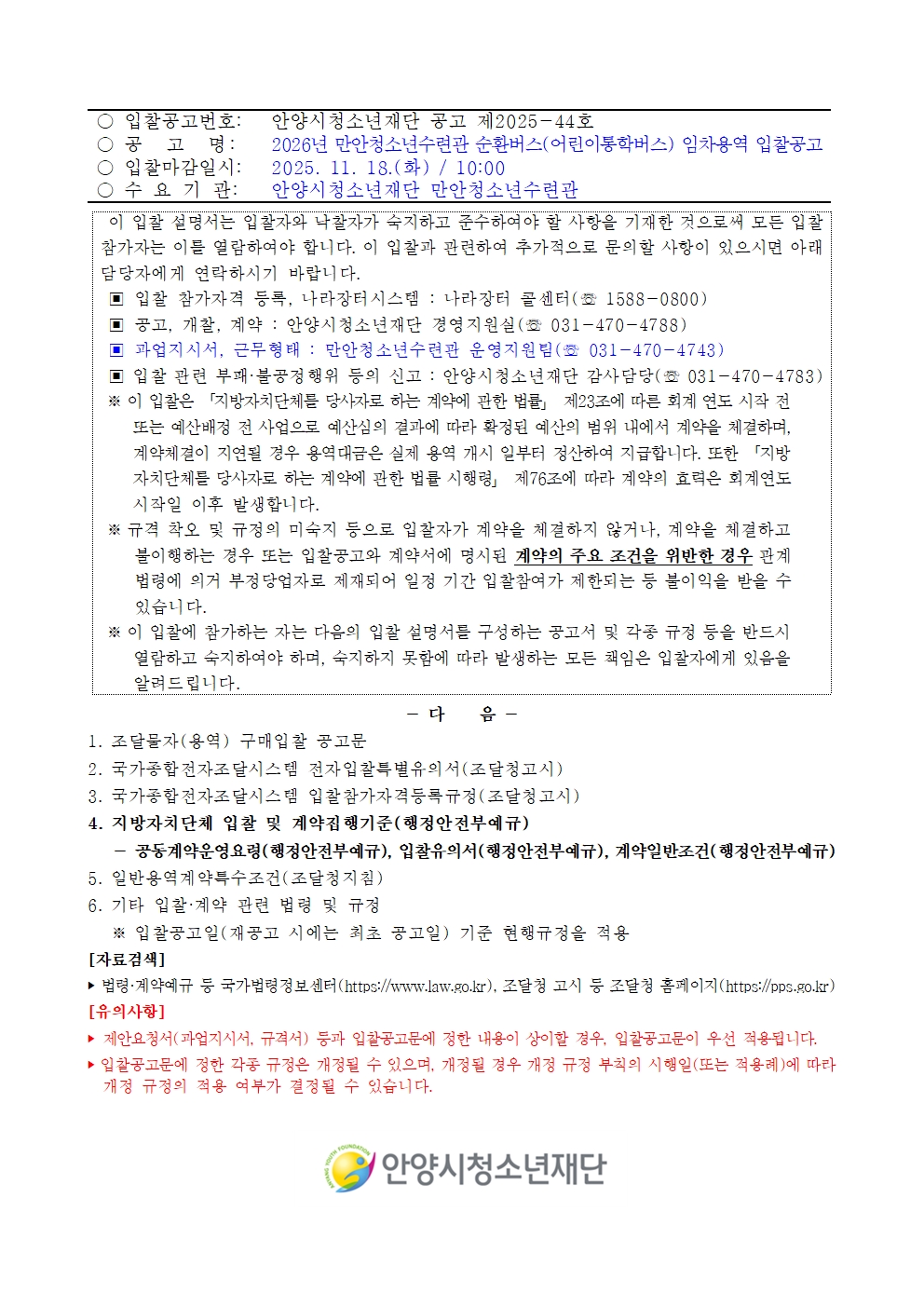 | 제목 | 2026년 만안청소년수련관 순환버스(어린이 통학버스) 임차 용역 공개 입찰공고 |