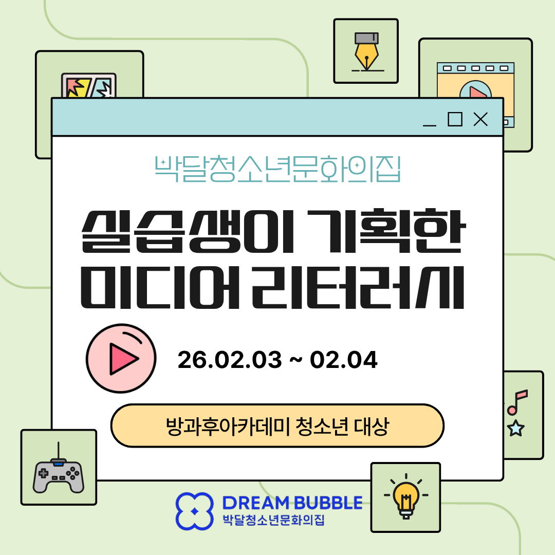 시설 박달청소년문화의집 | 작성자 박******** | [대학생 현장실습]박달청소년문화의집 대학생 현장실습생이 기획한 미디어 리터러시 프로그램 | 작성일 2026-02-22 |