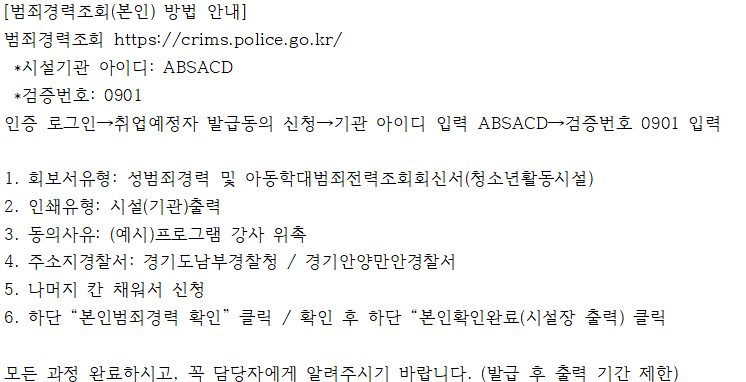 프로그램 강사 위촉 서류 안내 1. 강사 이력서(교육 내용에 대한 이력, 경력이 확인 될 수 있도록 작성 부탁드립니다.) 2. 강사 자격 확인서류(최종 학력증명서 또는 자격증 또는 경력증명서 등) - 위촉 또는 강의료 산정에 기준이 되는 자격을 확인할 수 있는 서류 제출 * 강사의 위촉 기준이 관련분야 지도경력 0년 이상인 경우 - 경력증명서 * 강사의 위촉 기준이 관련분야 전공자로서 지도경력이 00년 이상인 경우 - 최종 학력증명서 와 경력증명서) 3. 강사비 지급에 관련한 서류(신분증 및 통장사본) 5. 법정 의무교육 수료증 3종 - 기존에 수강하신 과목이 있는 경우, 과목명이 다르더라도 동일 의무교육 이라면 제출 가능합니다.) | 1. 2026년 신고의무자 및 공공부문 아동학대 예방교육 (공통편) | | https://www.gseek.kr/user/course/online/view?s_sbjct_sn=12387&s_sbjct_cycl_sn=1 | | 2. 장애인학대 및 장애인 대상 성범죄 신고의무자 교육(국문) | | https://www.gseek.kr/user/course/online/view?s_sbjct_sn=57467&s_sbjct_cycl_sn=1 | | 3. 2026년 긴급복지지원 신고의무교육(수어제공) | | https://www.gseek.kr/user/course/online/view?s_sbjct_sn=56708&s_sbjct_cycl_sn=1 |