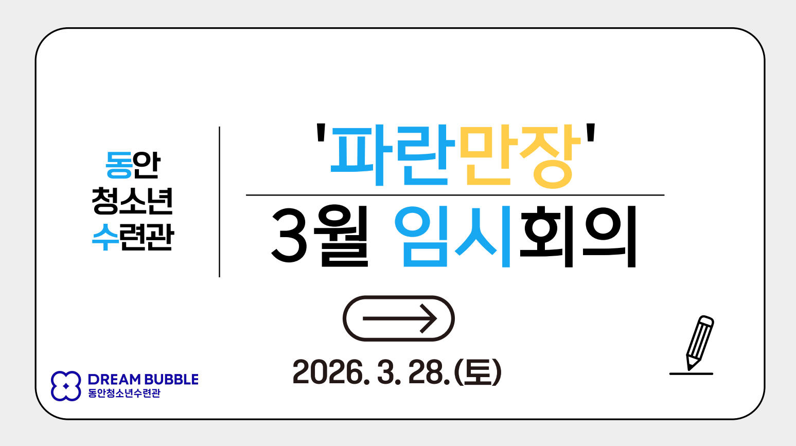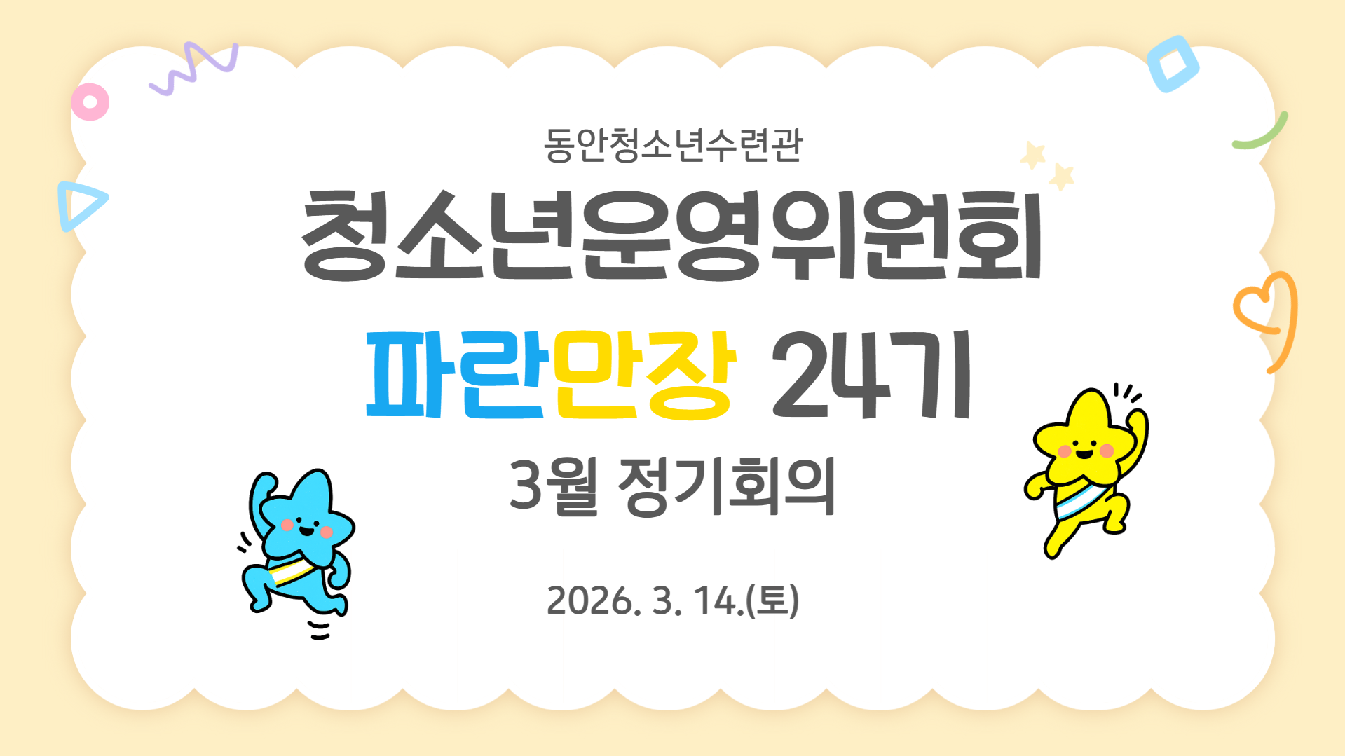 시설 동안청소년수련관 | 작성자 홍** | 청소년운영위원회 파란만장 24기 3월 정기회의&임원진 선출 | 작성일 2026-03-19 |