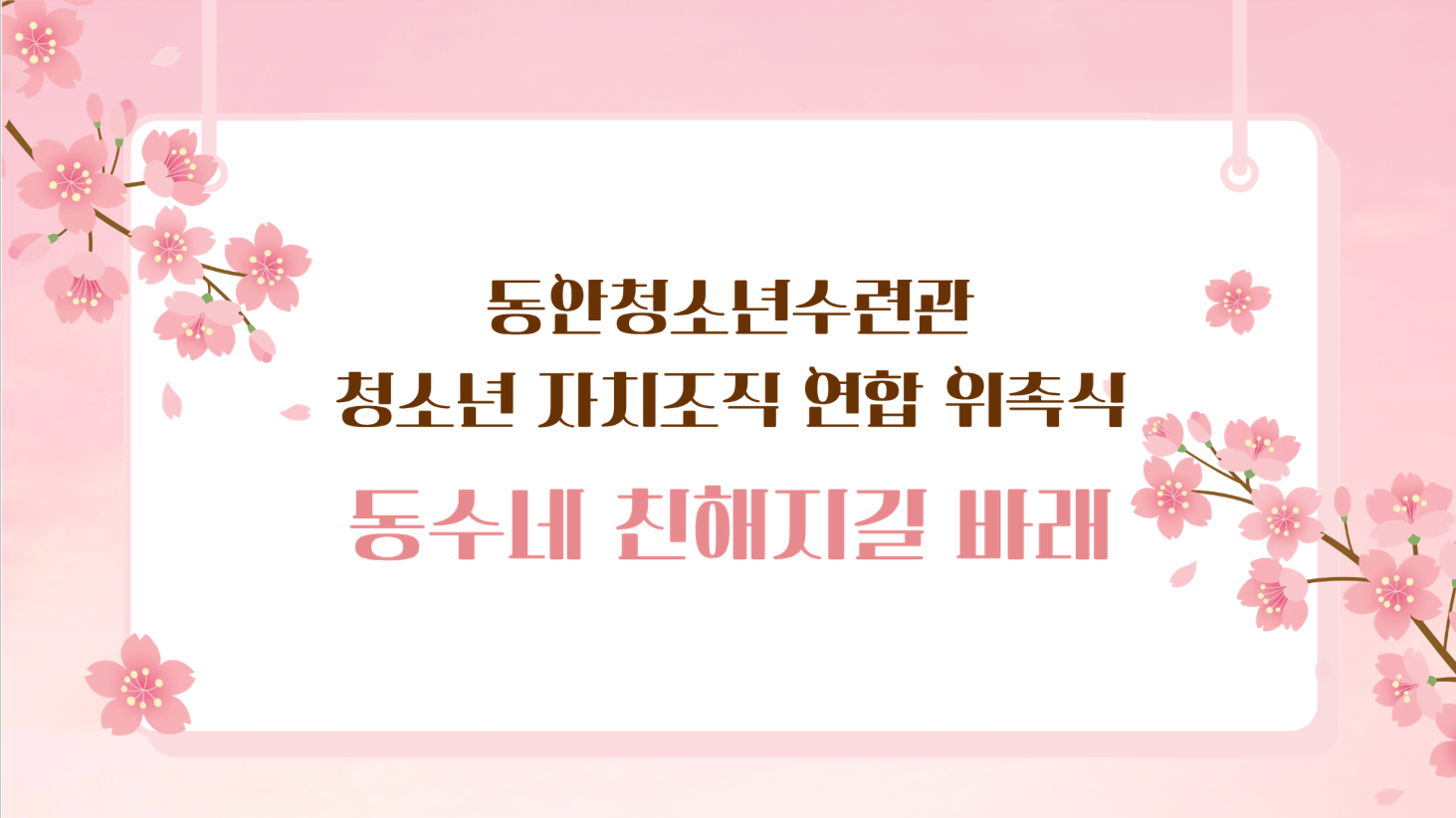 시설 동안청소년수련관 | 작성자 홍** | 2026년 청소년자치조직 연합 위촉식 - 동수네 친해지길 바래 | 작성일 2026-03-31 |