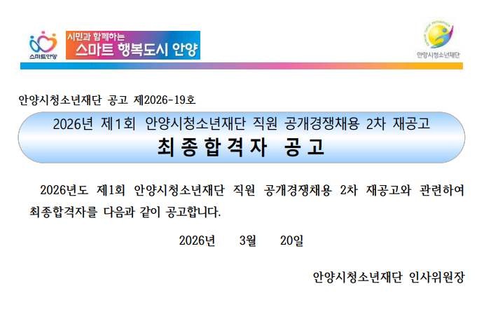 | 제목 | [공고]2026년 제1회 안양시청소년재단 직원 공개경쟁채용 2차 재공고 최종합격자 공고 |