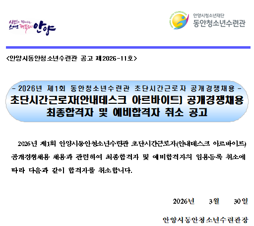 | 제목 | [제2026-11호]제1차 동안청소년수련관 초단시간근로자 공개경쟁채용 최종합격자 및 예비합격자 취소 공고 |