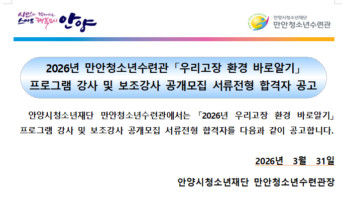 | 제목 | 2026년 만안청소년수련관 우리고장 환경 바로알기 프로그램 강사 및 보조강사 서류전형 합격자 공고 및 면접심사 안내 |