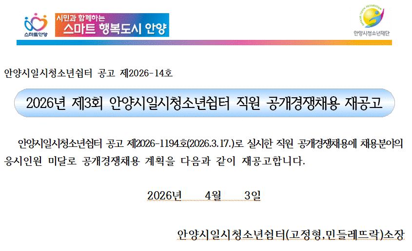 | 제목 | [공고]2026년 제3회 안양시일시청소년쉼터 직원 공개경쟁채용 재공고 |