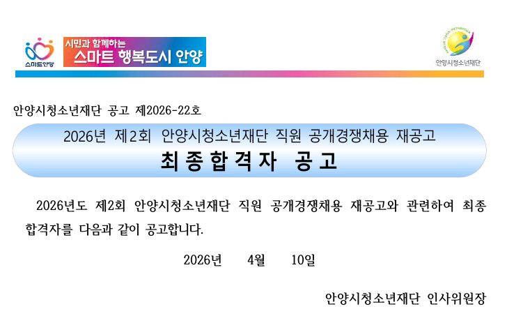 | 제목 | [공고]2026년 제2회 안양시청소년재단 직원 공개경쟁채용 재공고 최종합격자 공고 |