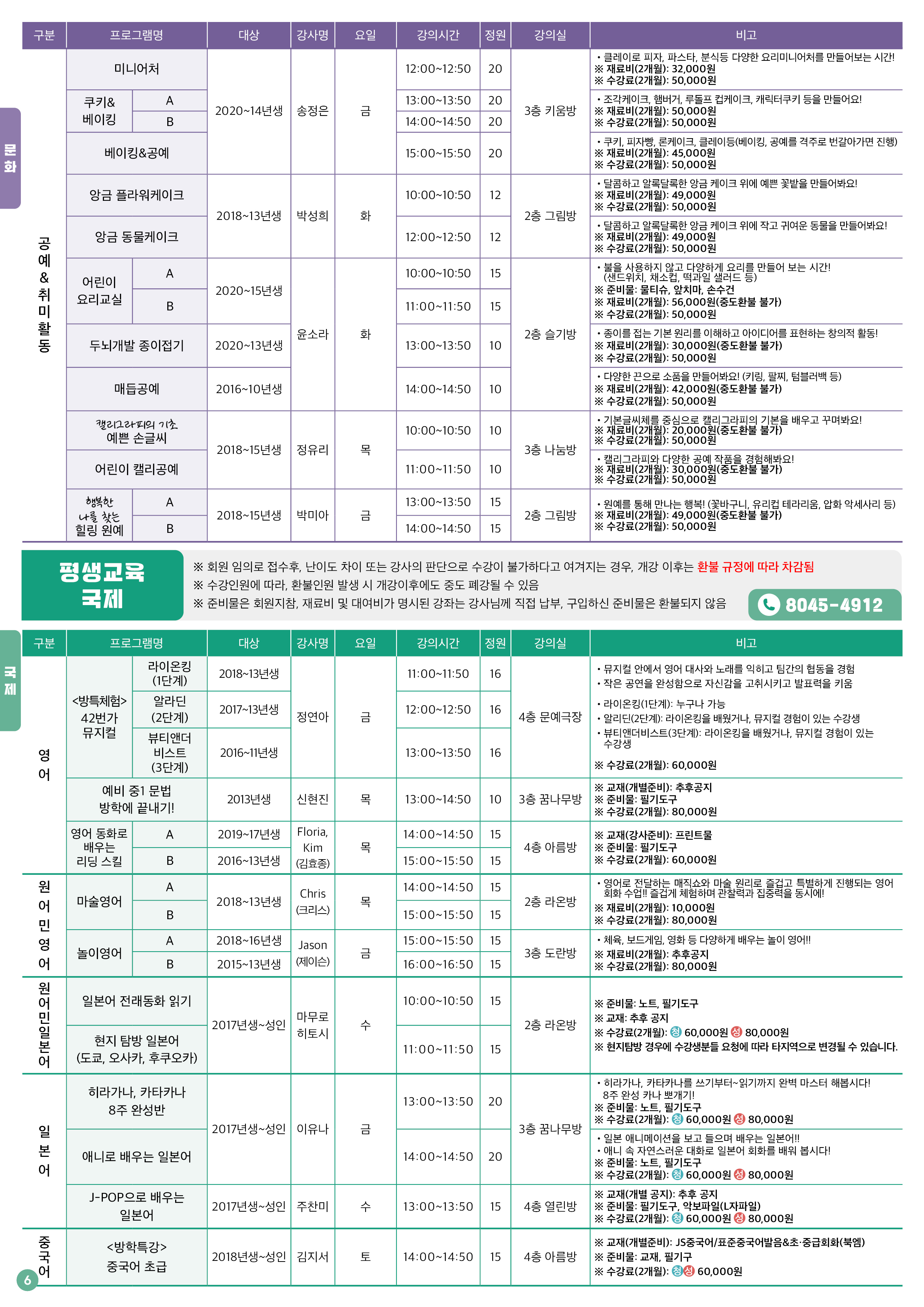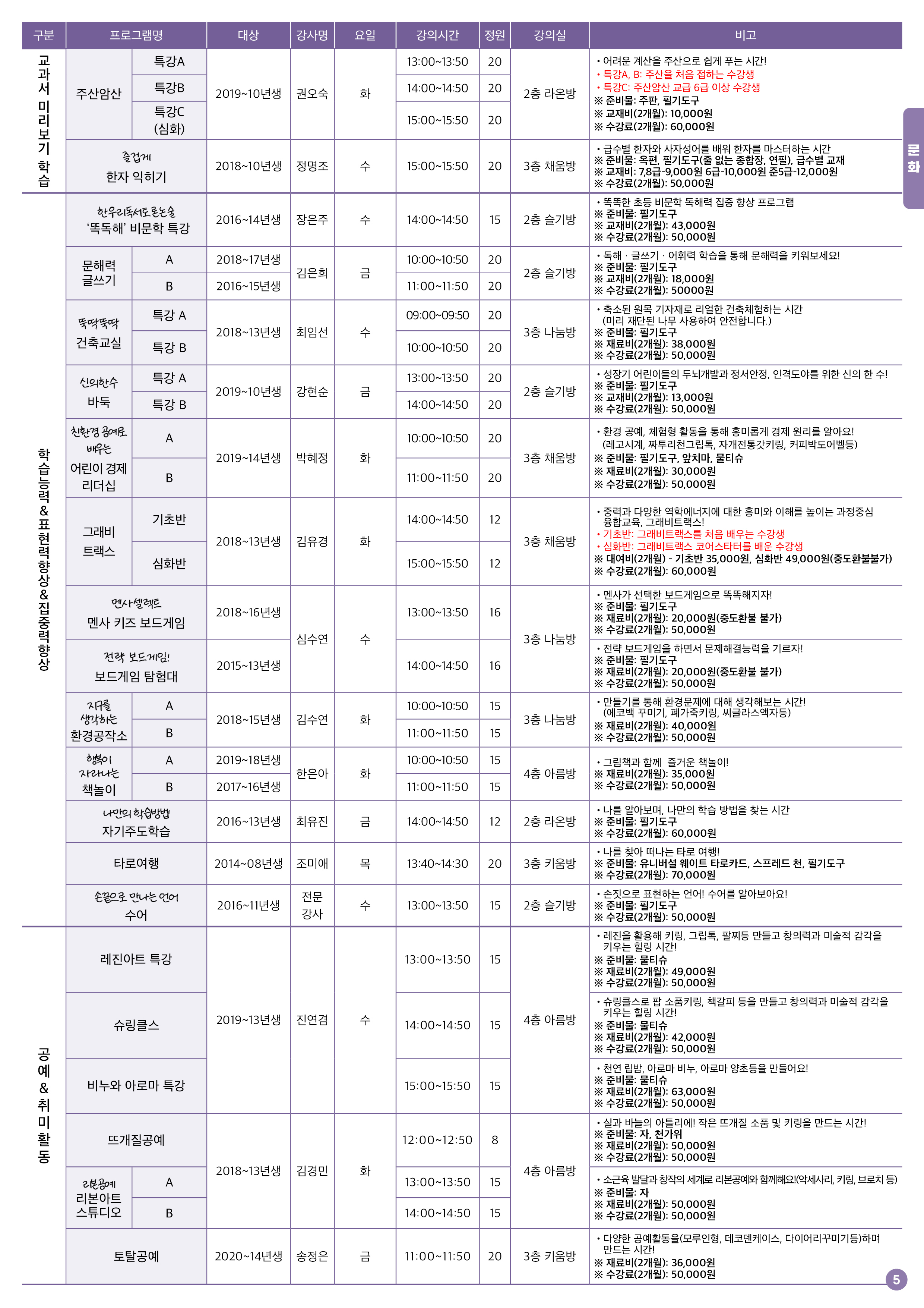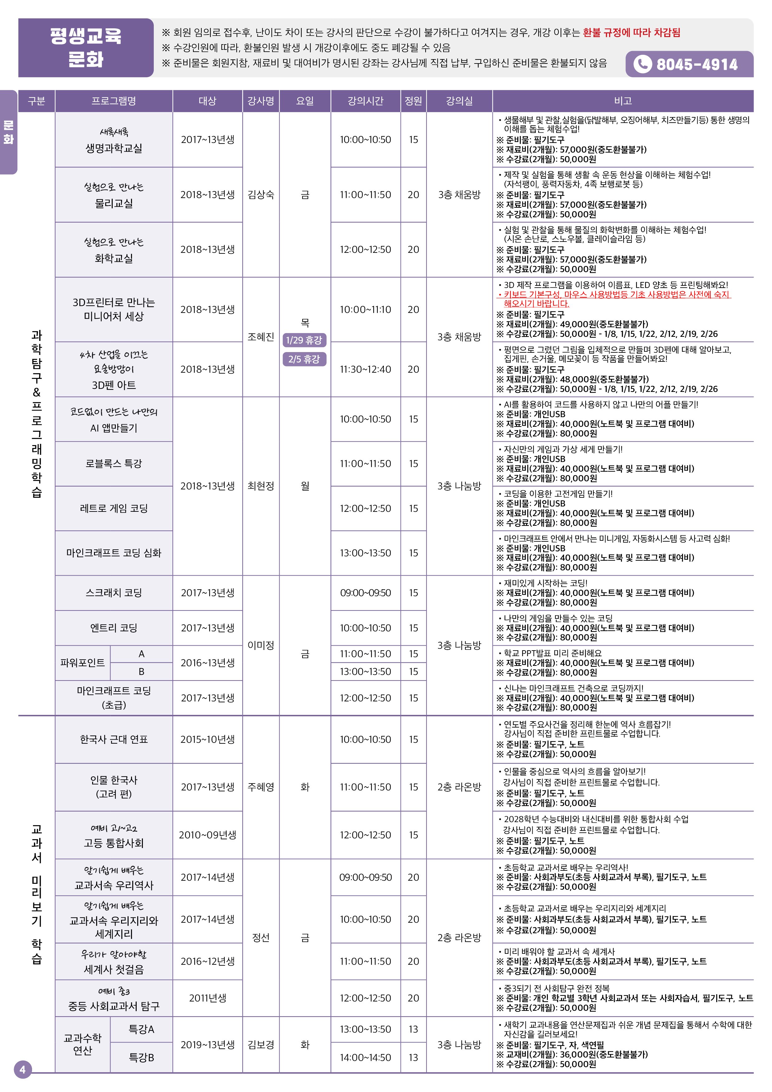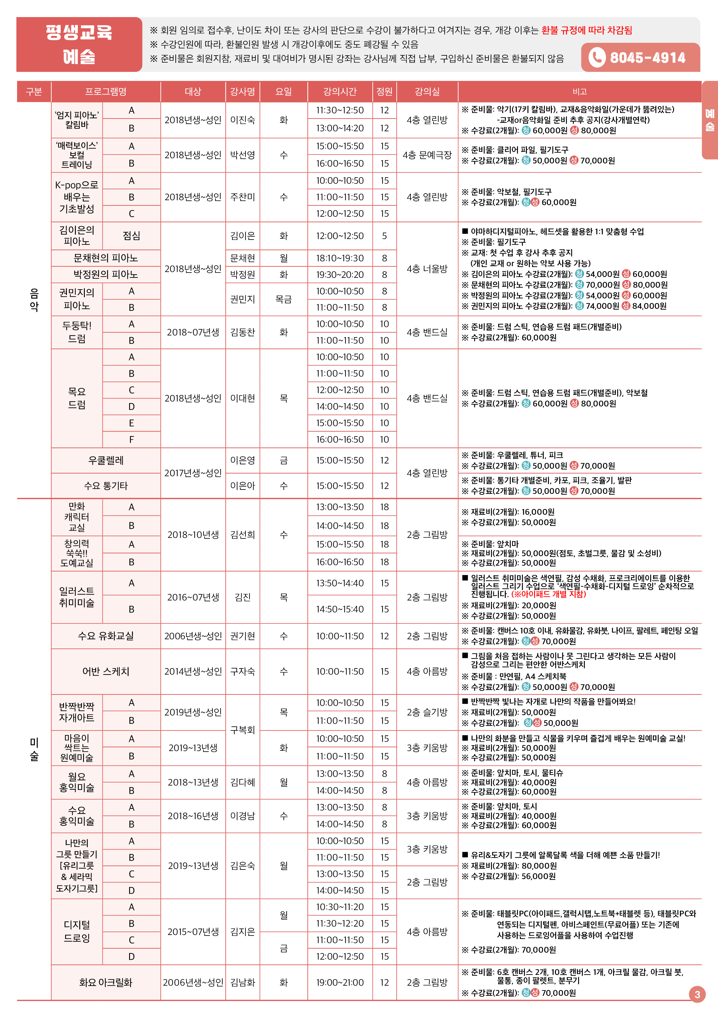 준비물은 회원 지참, 재료비 및 대여비가 명시된 강좌는 강사님께 직접 납부, 구입하신 준비물은 환불되지 않음