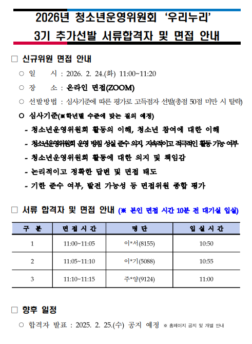 2026년 청소년운영위원회 '우리누리' 3기 추가선발 서류합격자 및 면접 안내
