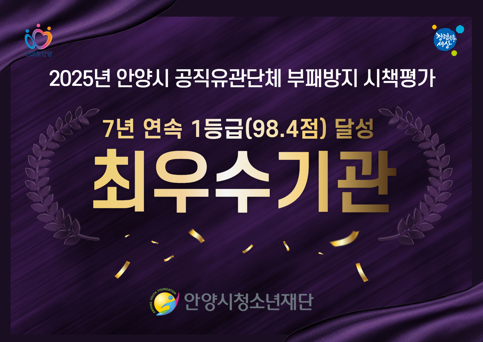 안양시청소년재단 2025년 안양시 공직유관단체 부패방지 시책평가 ‘7년 연속 최우수기관 선정’ 쾌거1등급(98.4점) 획득 및 청렴도 최우수기관 선정