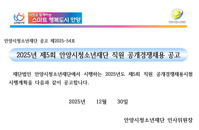 | 제목 | [공고]2025년 제5회 안양시청소년재단 직원 공개경쟁채용 공고 |