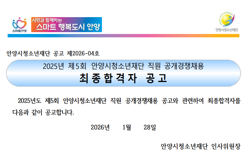 | 제목 | [공고]2025년 제5회 안양시청소년재단 직원 공개경쟁채용 최종합격자 공고 |