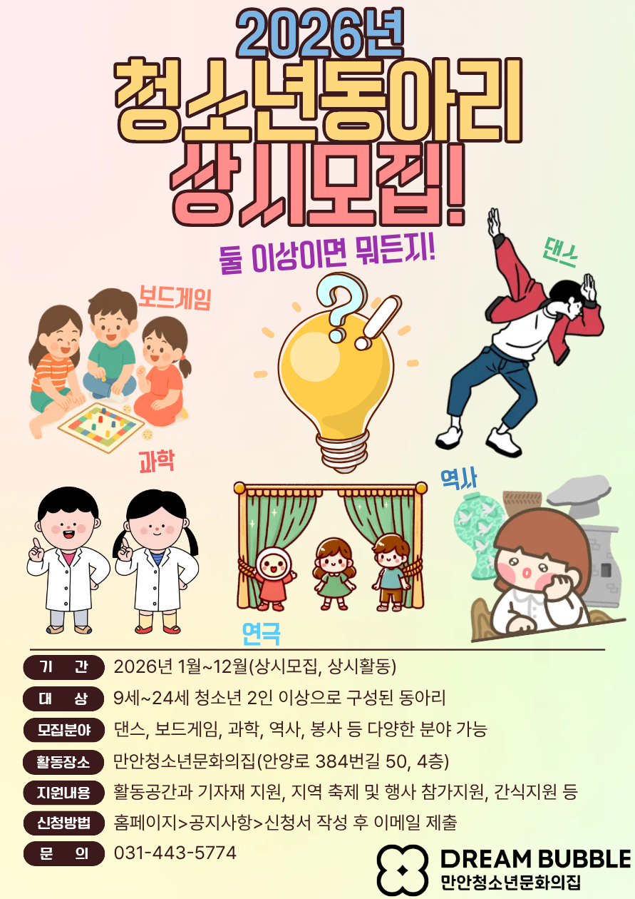 ▷ 기간: 2026년 1월 ~ 12월 (연중 상시 모집) ▷ 대상: 9세~24세 미만 청소년 2인 이상인 동아리 ▷ 혜택: 소속 동아리 공간 대여, 물품 및 간식 지원, 지역사회 행사 참여 등 ▷ 신청 방법: 첨부파일 다운로드 후 담당자 이메일(0727@ayf.or.kr) 또는 현장 제출