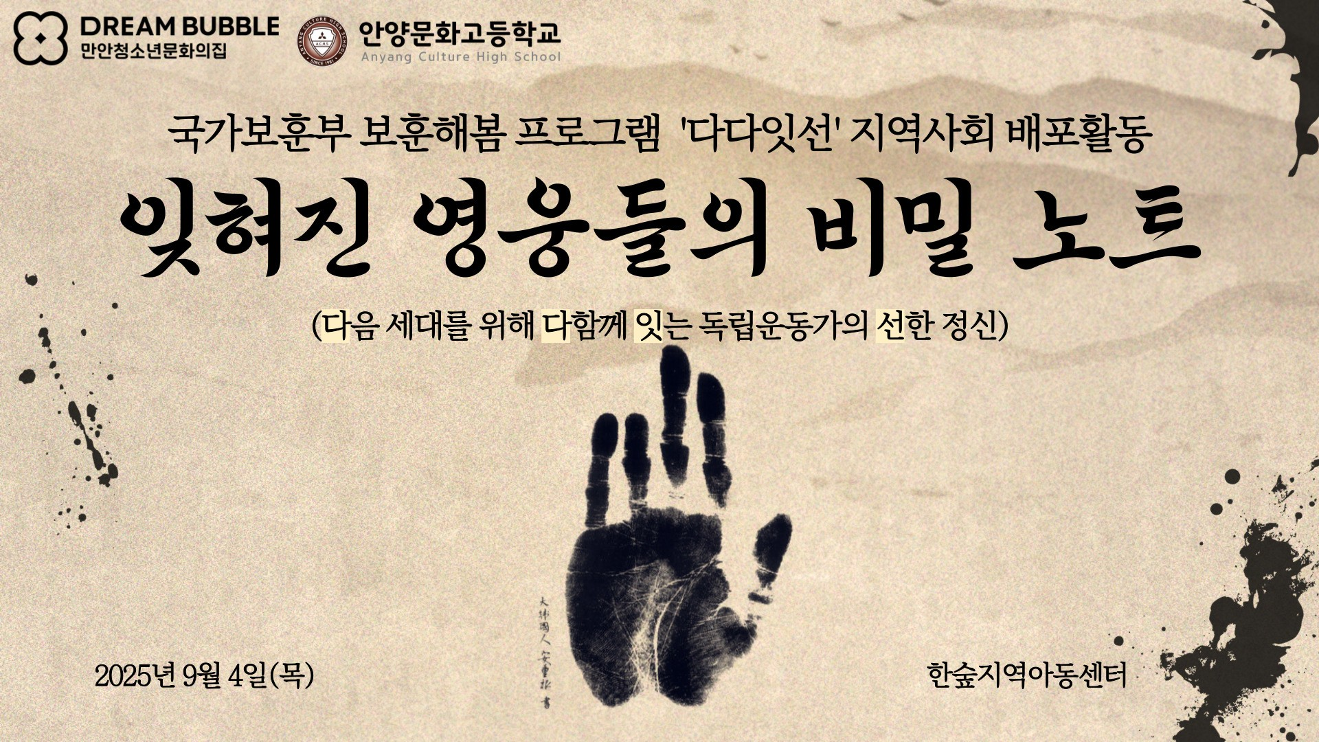 6 | 만안청소년문화의집 ‘다다잇선’ 독립운동가 AI 영상 상영 및 역사 교육 | 첨부파일 첨부 파일 | 만안청소년문화의집 ‘다다잇선’ 독립운동가 AI 영상 상영 및 역사 교육 - 지역 아동과 함께 독립운동의 가치를 잇다 - 안양시청소년재단(이사장 최대호) 산하 만안청소년문화의집(소장 김유식)은 지난 4일 안양문화고등학교와 함께 한숲지역아동센터에서 국가보훈부 공모사업 ‘다다잇선’ 지역사회 전파활동을 진행했다. 이번 활동은 안양문화고등학교 청소년들이 직접 기획하고 준비한 것으로, 지... | 등록자 만안청소년문화의집 | 작성일 2025-11-25 |