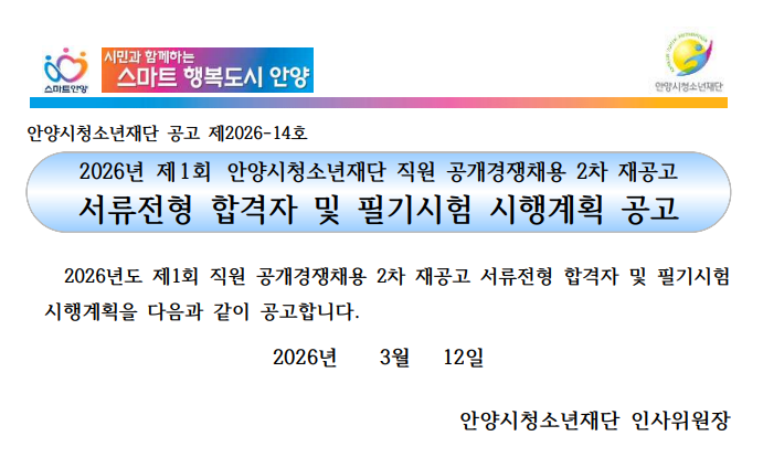 | 제목 | [공고]2026년 제1회 안양시청소년재단 직원 공개경쟁채용 2차 재공고 서류전형 합격자 및 필기시험 시행계획 공고 |
