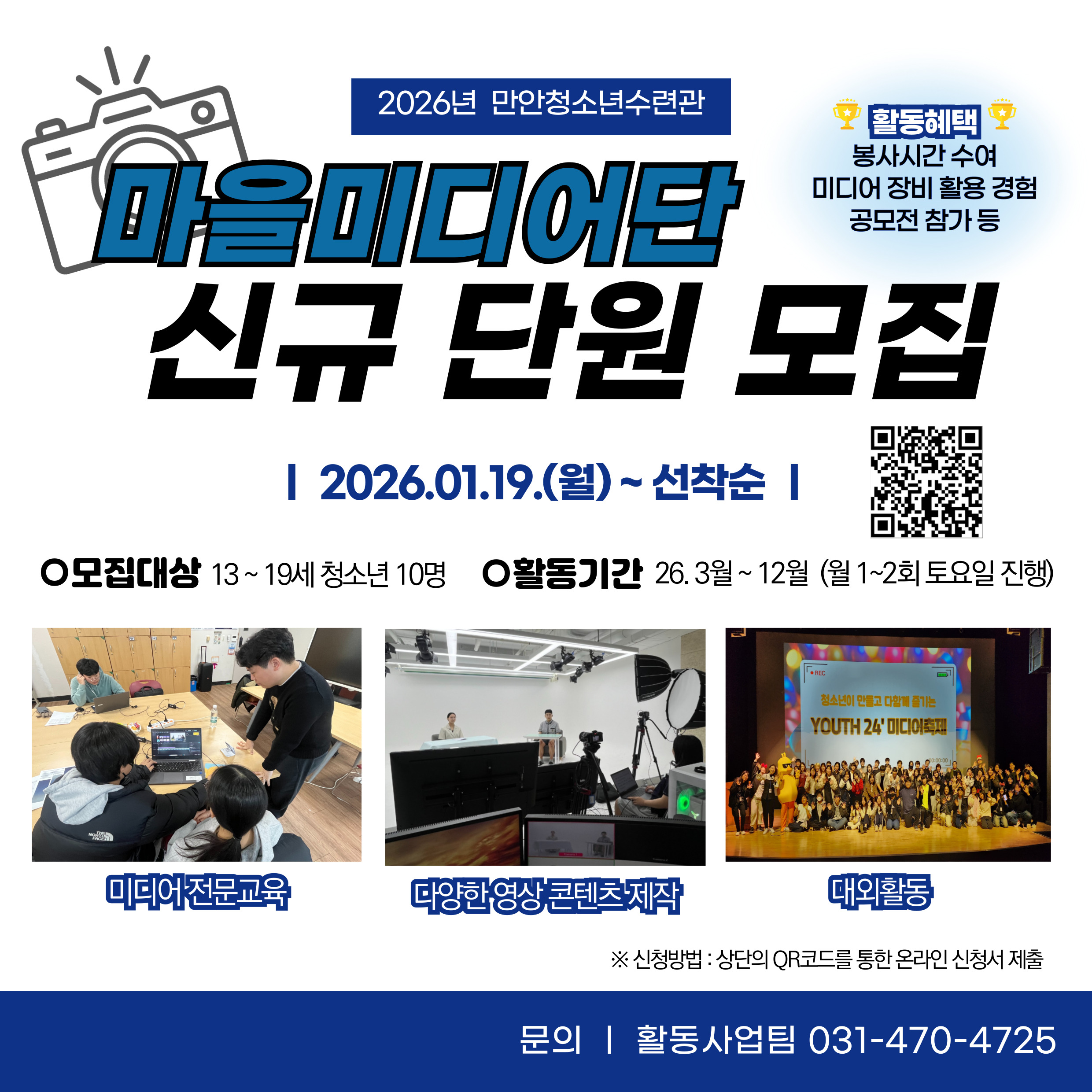 ★ 하단의 QR코드 또는 신청 링크(https://moaform.com/q/92Cylq)를 통해 신청 후 유선 연락바랍니다.☎ 활동사업팀 031-470-4725![]() |