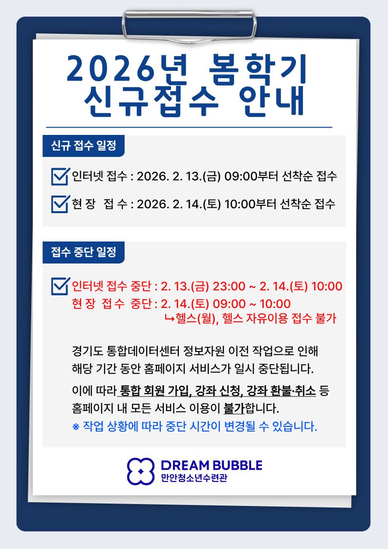 | 제목 | [공지] 2026년 만안청소년수련관 봄학기 수강생 모집 |