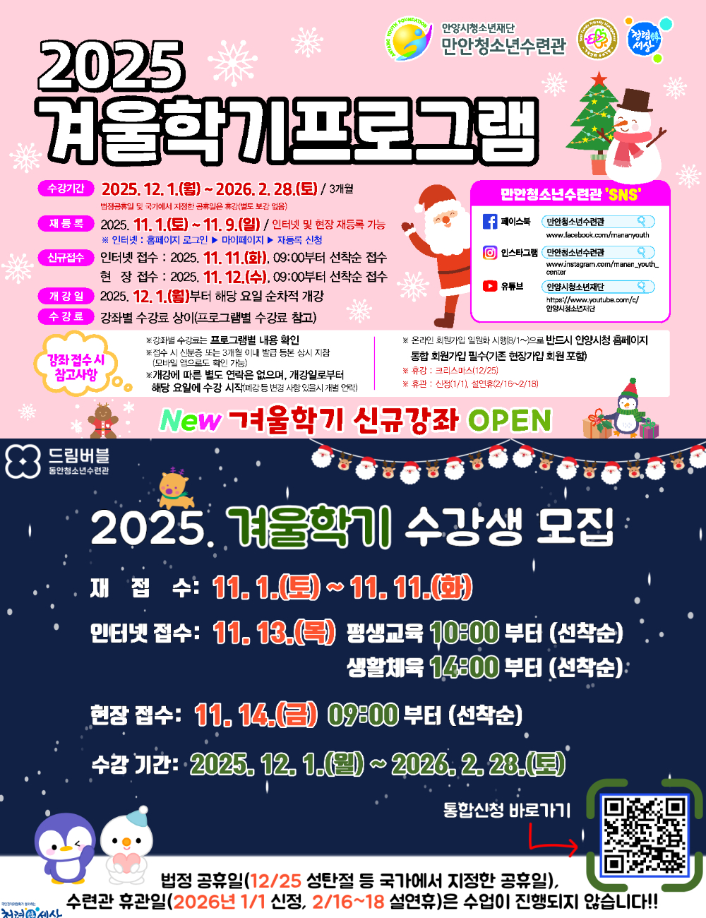 20 | 만안 · 동안청소년수련관 겨울학기 수강생 모집 | 첨부파일 첨부 파일 | 만안 · 동안청소년수련관 겨울학기 수강생 모집 안양시청소년재단(이사장 최대호) 산하 만안청소년수련관(관장 이정순)과 동안청소년수련관(관장 이주)은 2025년 겨울학기 강좌 수강생을 모집한다. 만안청소년수련관은 12월 1일부터 2026년 2월 28일까지 겨울학기 프로그램을 운영한다. 이번 학기에는 총 124개 강좌 225개 반이 개설되어 배드민턴, 탁구 등 체... | 등록자 만안청소년수련관 | 작성일 2025-11-25 |