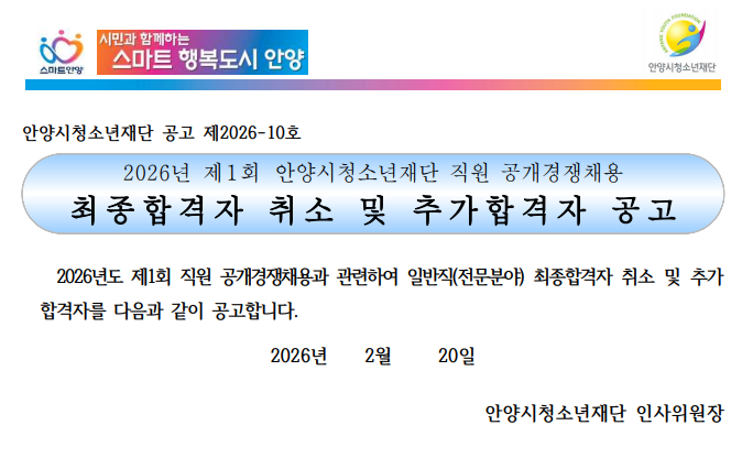 | 제목 | [공고]2026년 제1회 안양시청소년재단 직원 공개경쟁채용 최종합격자 취소 및 추가합격자 공고 |