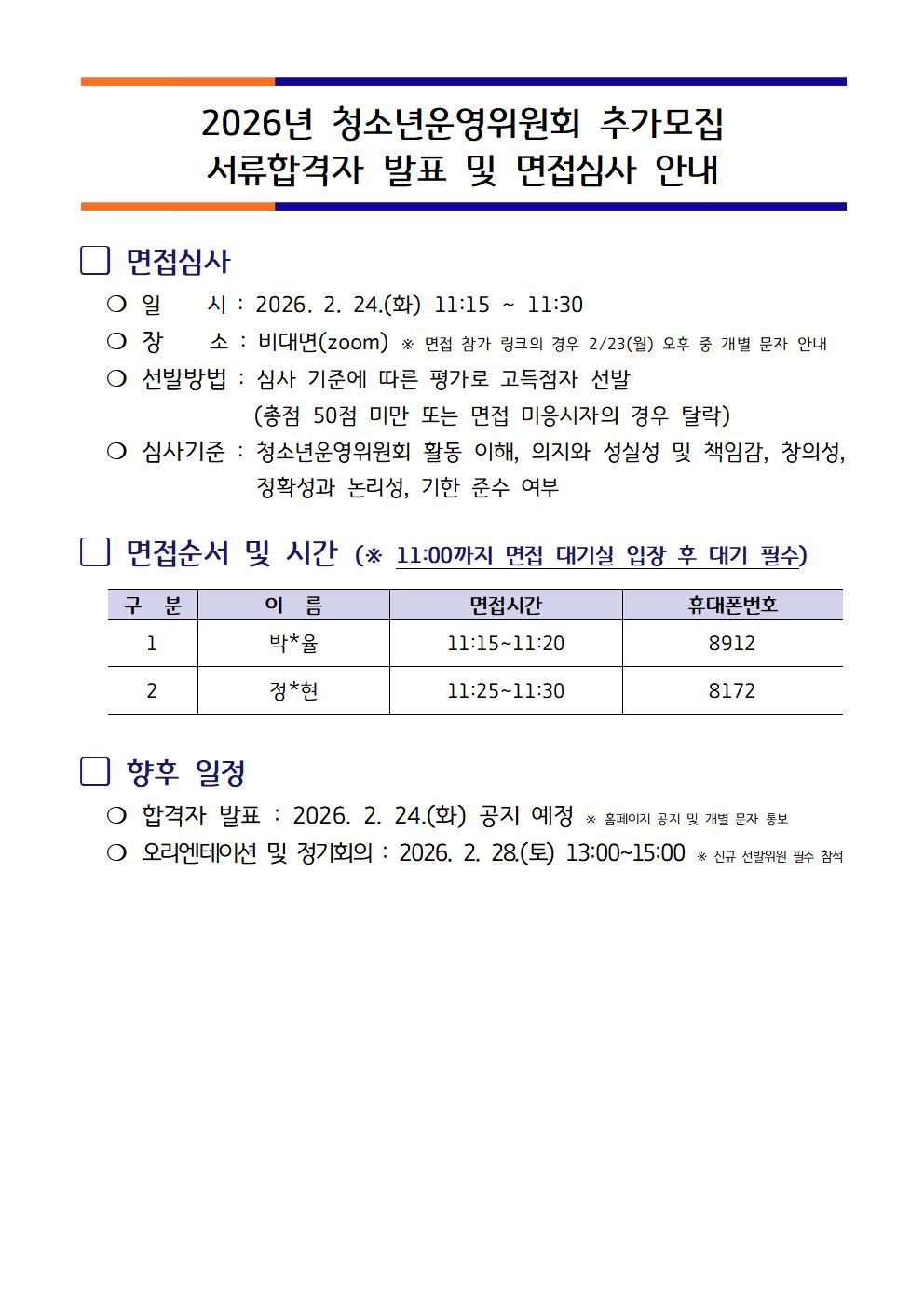 | 제목 | 2026년 청소년운영위원회 '꿈틀' 9기 신규 위원 추가 모집 서류합격자 및 면접 안내 |
