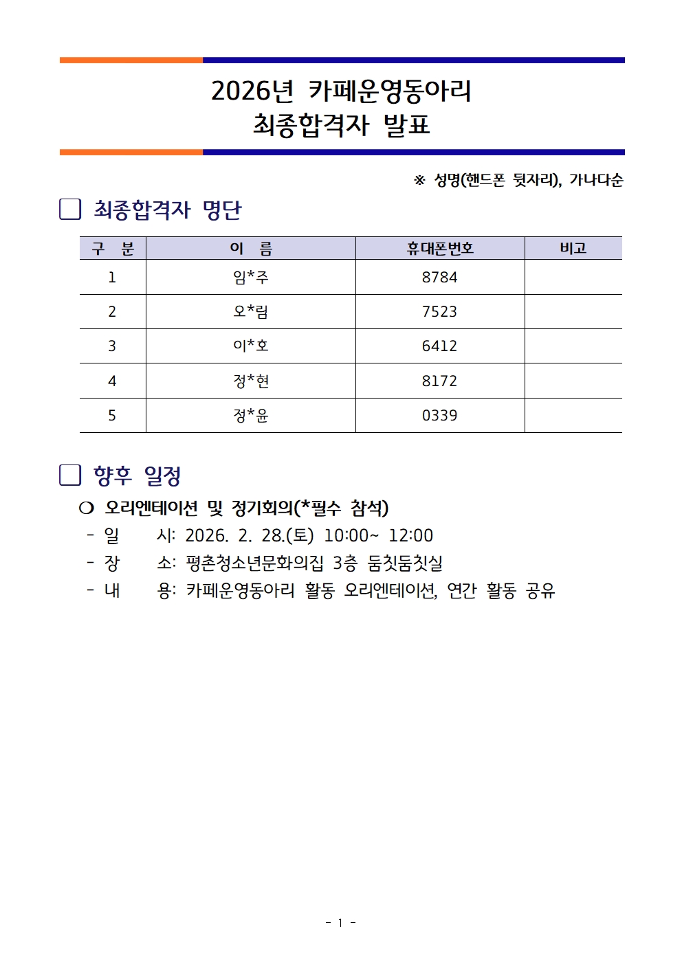 [공고] 카페운영동아리 '카페지기' 최종합격자 발표