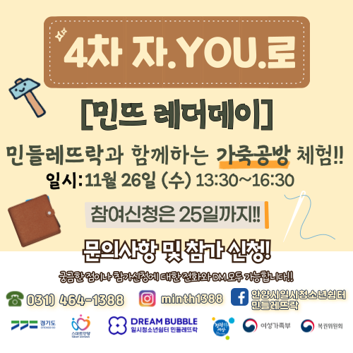 네 번째 자.YOU.로는 가죽공방 체험을 하러갈 예정입니다!!!