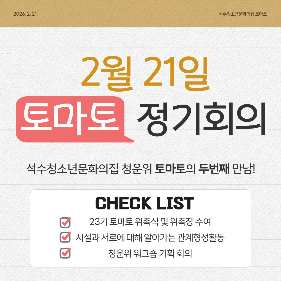 시설 석수청소년문화의집 | 작성자 석******** | [청소년운영위원회] 2월 정기회의 및 위촉식 | 작성일 2026-02-23 |
