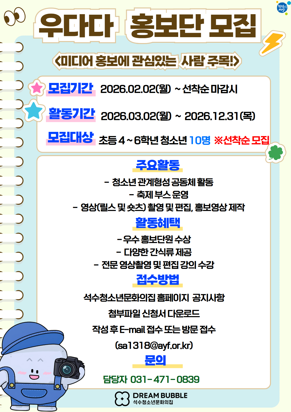 [모집] 2026년 석수청소년문화의집 '우다다홍보단' 동아리원 모집
